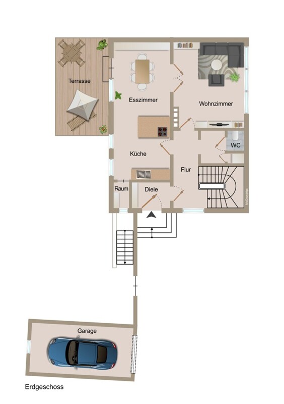 Im Außenbereich genießen Sie die schön gestaltete und überdachte Terrasse. Hier können Sie die Seele baumeln lassen. Zudem haben Sie im Garten ausgiebige Möglichkeiten für eine individuelle Gestaltung. Für die Kinder gibt es viel Platz um zu spielen und sich auszutoben.
