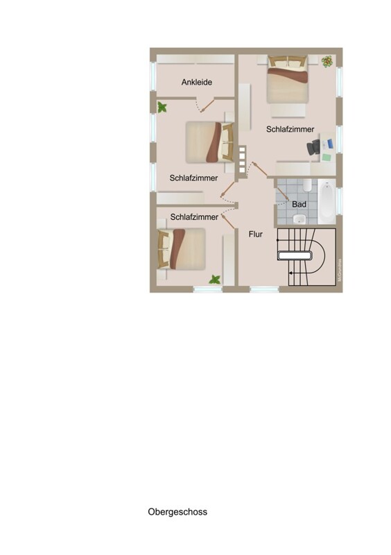 In Obdergeschoss befinden sich drei Schlafräume. Ein Schlafzimmer hat zusätzlich einen angrenzenden Ankleideraum oder auch zusätzliches Kinderzimmer. Vom Flur ist auch das Badezimmer zu begehen.