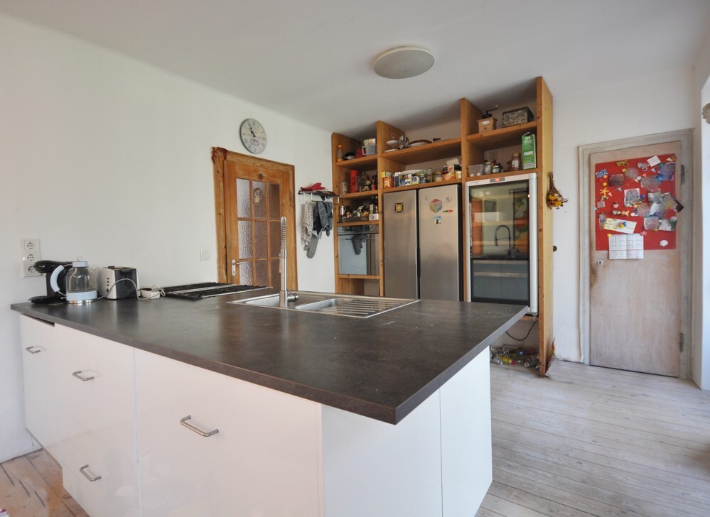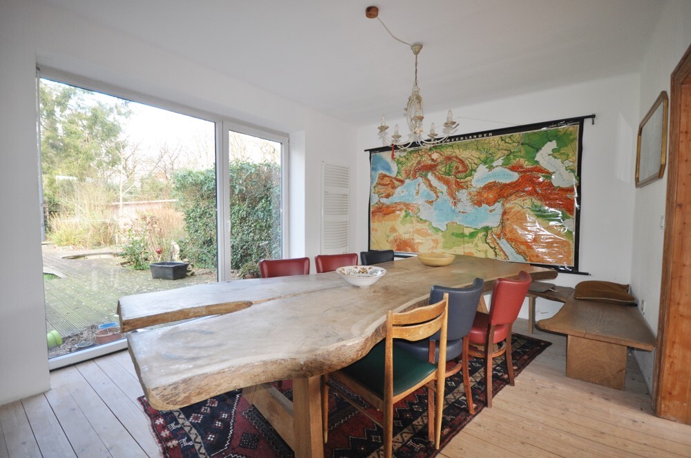 Der großzügige Wohn-, Ess- und Küchenbereich wurde in offener Bauweise umgesetzt. An kalten Tagen sorgt ein Kaminofen in diesem Bereich für angenehme Wärme und Wohlbefinden. Von der Küche und dem Essbereich ist ein direkter Zugang zur überdachten Terrasse und dem Garten gegeben.