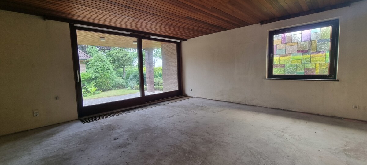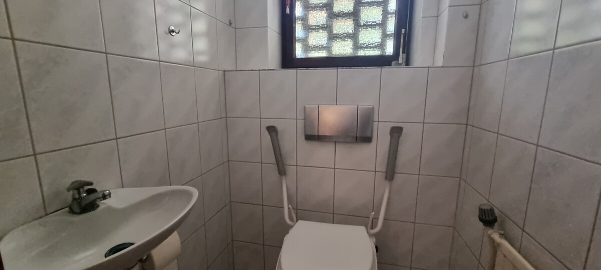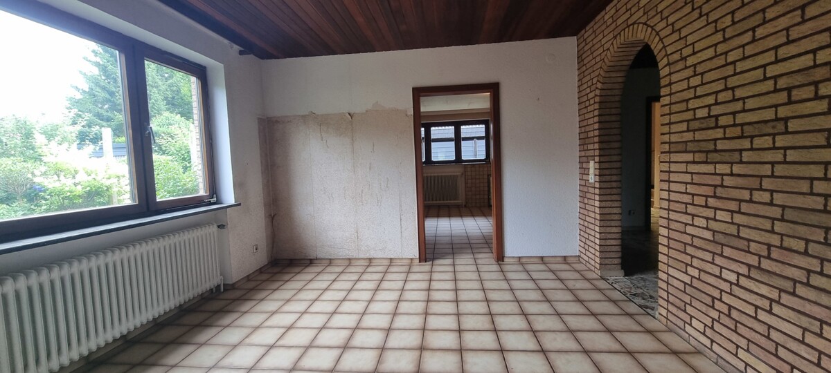 Diese führt zum Esszimmer und weitergehend zur Küche mit Abstellraum, sowie dem großen Wohnzimmer. Über das große Glaselement im Wohnzimmer kommen Sie auf die schöne überdachte Terrasse.