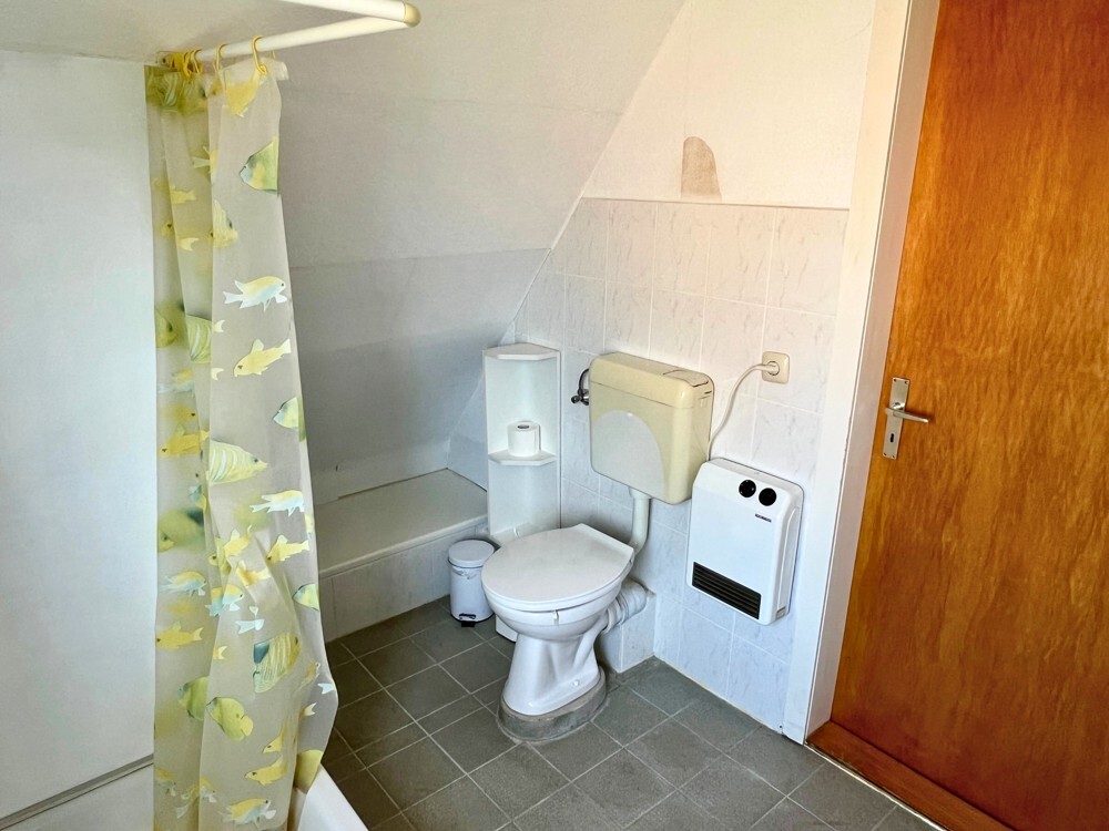 Über eine solide Holztreppe gelangen Sie ins Obergeschoss. Dort befinden sich zwei weitere Zimmer sowie ein Badezimmer mit Dusche, das 2012 modernisiert wurde.